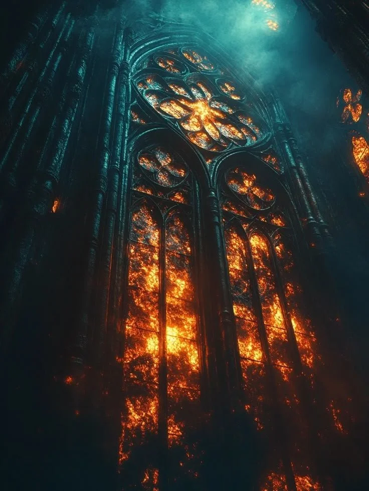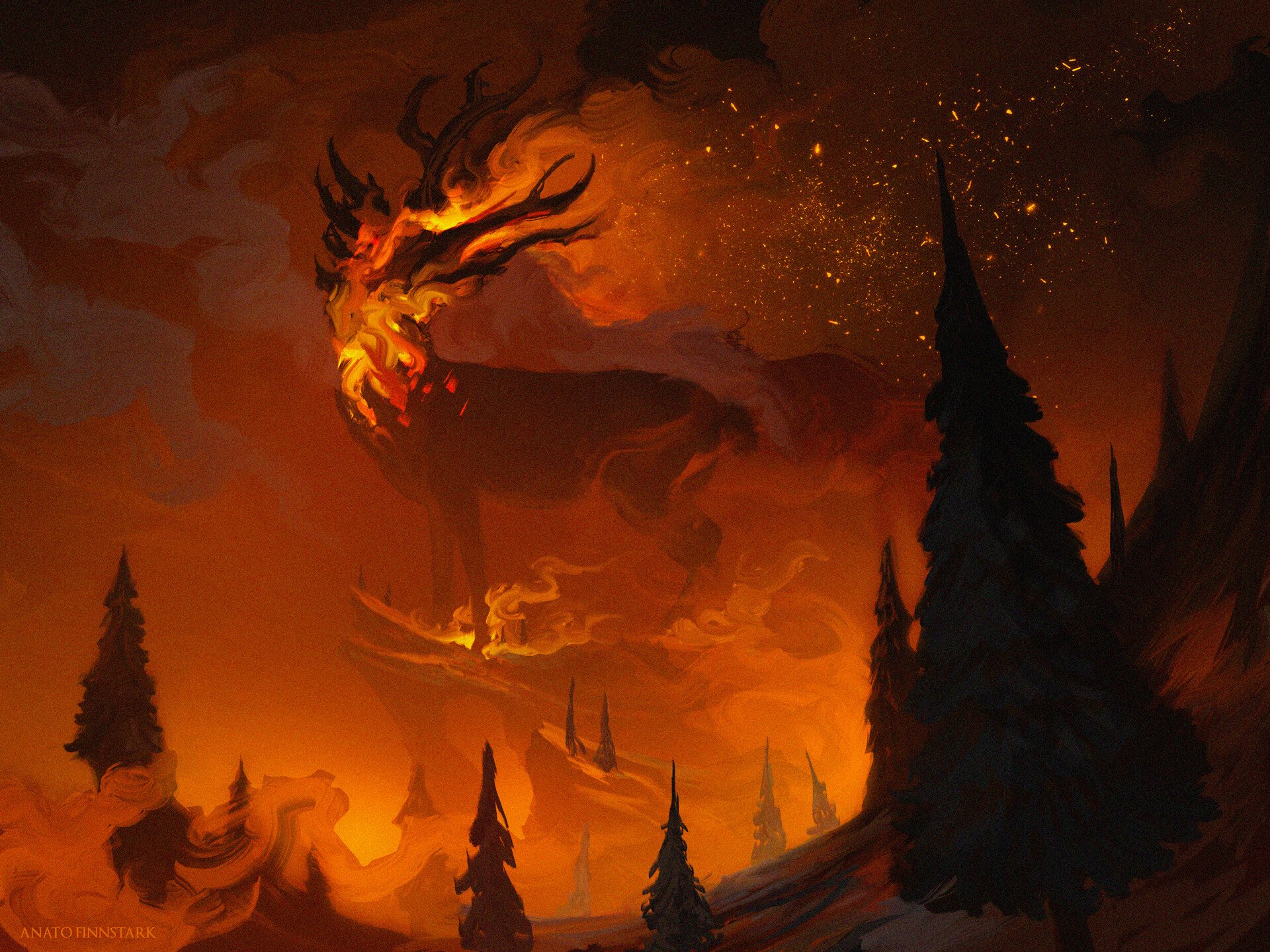 As a forest burns, a magnificent stag marches calmly through the flames, antlers on fire. He is the spirit of the forest.